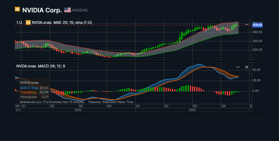 In his book, “Big trends in trading” Price Headley also explains how simple Moving Average Envelopes can be used in market timing. Moving Average Envelopes are simply a moving average of the price surrounded by the same average x % above and below the middle average. For weekly data Headly uses 15 % above and below the 20 week simple moving average. Most brokers have a technical analysis platform where you can set this up yourself, as illustrated here on SaxoBank’s SaxoTrader Go for NVIDIA with candle sticks price, weekly data and two year periode. MACD with MACD histogram in the chart below.